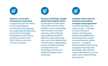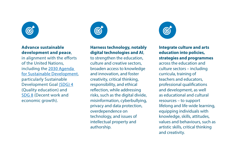 UNESCO’s framework calls for advancing sustainable development, peace, and quality education through culture.